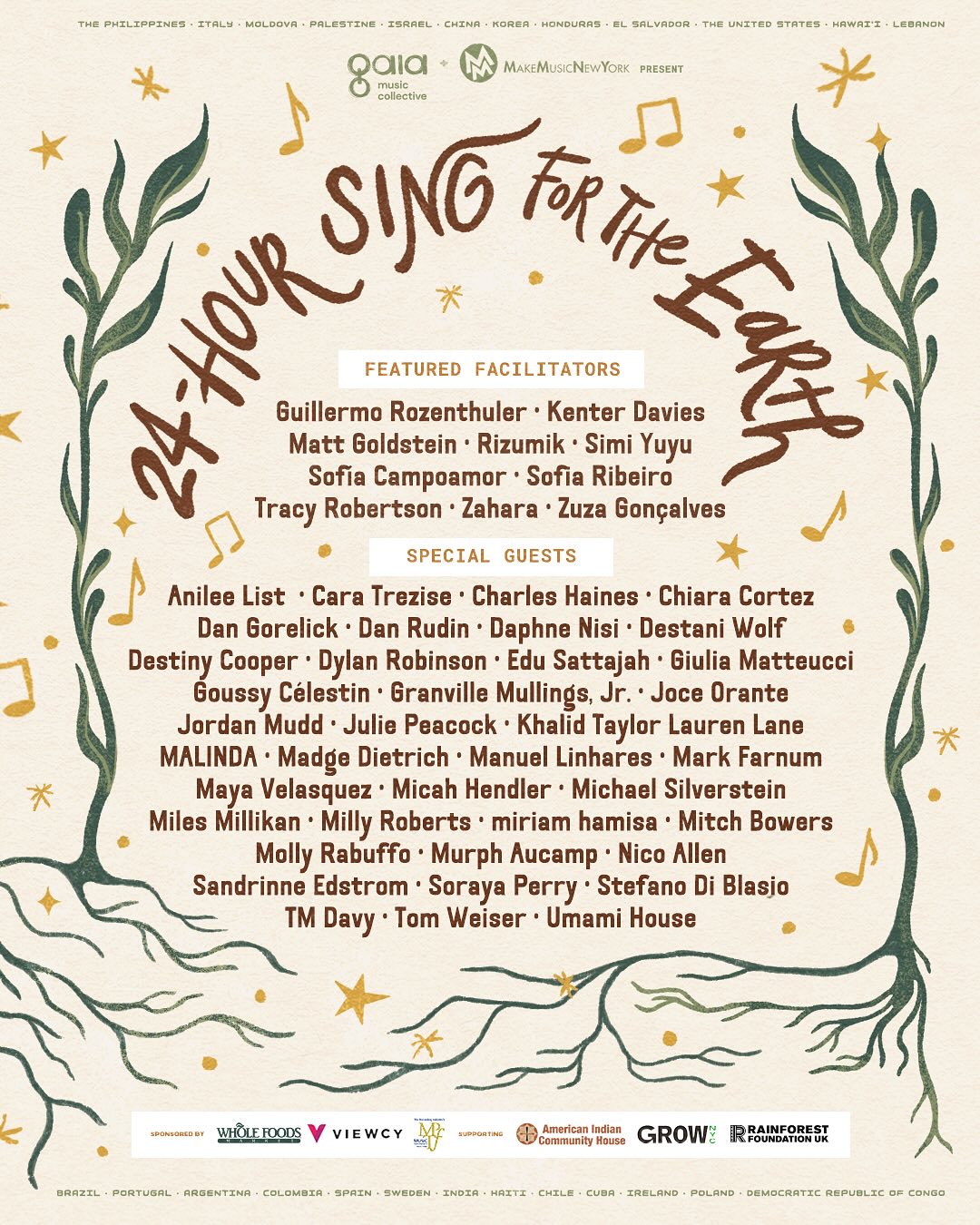 Gaia Music Collective & Make Music New York are excited to be partnering to put on our first ever 24-HOUR 🌎 SING FOR THE EARTH 🌍. This joyous celebration of music, nature, and community will take place in NYC on the Summer Solstice, June 21st! Inspired by the tradition of Bobby McFerrin’s Unbroken Circle, the idea is to gather for 24 hours of nonstop music-making in honor of our planet, including circle singing, improvisation, participatory performances, music games, dancing, and whatever else we can think of to keep the song spinning.